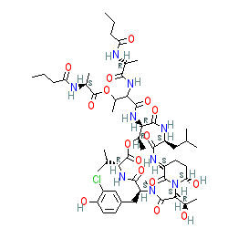 IUPAC name: 2-(2-butyramidopropanamido)-N-(5-(3-chloro-4-hydroxybenzyl)-21-hydroxy-2-(1-hydroxyethyl)-15-isobutyl-8-isopropyl-4,11-dimethyl-3,6,9,13,16,22-hexaoxo-10-oxa-1,4,7,14,17-pentaazabicyclo[16.3.1]docosan-12-yl)-3-(3-oxo-3-((3-oxobutan-2-yl)amino)propoxy)butanamide