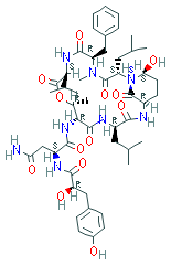 IUPAC name: (S)-N1-((1S,2S,5R,8S,11R,12R,15R,18R,21S)-5-benzyl-21-hydroxy-2,15-diisobutyl-8-isopropyl-4,11-dimethyl-3,6,9,13,16,22-hexaoxo-10-oxa-1,4,7,14,17-pentaazabicyclo[16.3.1]docosan-12-yl)-2-((R)-2-hydroxy-3-(4-hydroxyphenyl)propanamido)succinamide