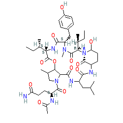 IUPAC name: (4S)-4-acetamido-5-((6S,9S,12R,13R)-6,12-di((S)-sec-butyl)-14-hydroxy-9-(4-hydroxybenzyl)-20-isobutyl-3,10-dimethyl-5,8,11,19,22,23-hexaoxoicosahydro-13,17-methanopyrrolo[2,3-t][1]oxa[4,7,10,15,18]pentaazacyclohenicosin-1(2H)-yl)-5-oxopentanamide