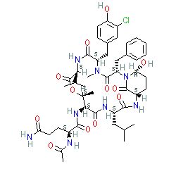 IUPAC name: (2S)-2-acetamido-N1-((2S,5S,8S,11S,12S,15S,18S,21R)-2-benzyl-5-(3-chloro-4-hydroxybenzyl)-21-hydroxy-15-isobutyl-8-isopropyl-4,11-dimethyl-3,6,9,13,16,22-hexaoxo-10-oxa-1,4,7,14,17-pentaazabicyclo[16.3.1]docosan-12-yl)pentanediamide