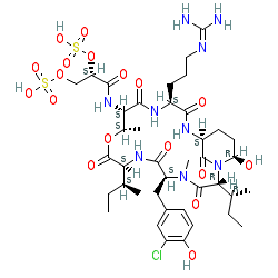 IUPAC name: (2S)-3-(((2R,5S,8S,11S,12S,15S,18S,21R)-2-((R)-sec-butyl)-8-((S)-sec-butyl)-5-(3-chloro-4-hydroxybenzyl)-15-(3-((diaminomethylene)amino)propyl)-21-hydroxy-4,11-dimethyl-3,6,9,13,16,22-hexaoxo-10-oxa-1,4,7,14,17-pentaazabicyclo[16.3.1]docosan-12-yl)amino)-3-oxopropane-1,2-diyl bis(hydrogen sulfate)