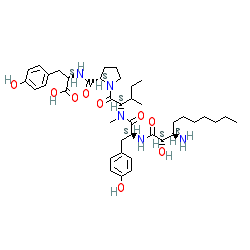 IUPAC name: (2S)-2-[[(2S)-1-[(2S,3S)-2-[[(2S)-2-[[(2S,3R)-3-amino-2-hydroxydecanoyl]amino]-3-(4-hydroxyphenyl)propanoyl]-methylamino]-3-methylpentanoyl]pyrrolidine-2-carbonyl]amino]-3-(4-hydroxyphenyl)propanoic acid