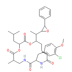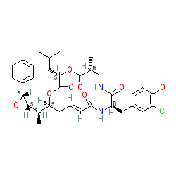 IUPAC name: (3S,6R,10R,13E,16S)-10-[(3-chloro-4-methoxyphenyl)methyl]-6-methyl-3-(2-methylpropyl)-16-[(1S)-1-[(2R,3S)-3-phenyloxiran-2-yl]ethyl]-1,4-dioxa-8,11-diazacyclohexadec-13-ene-2,5,9,12-tetrone