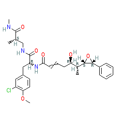 IUPAC name: (5R,6R)-N-((R)-3-(3-chloro-4-methoxyphenyl)-1-(((S)-2-methyl-3-(methylamino)-3-oxopropyl)amino)-1-oxopropan-2-yl)-5-hydroxy-6-((2S,3R)-3-phenyloxiran-2-yl)hept-2-enamide