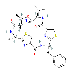 IUPAC name: (4S,7R,8S,11S,18S)-18-benzyl-7,11-dimethyl-4-propan-2-yl-6-oxa-13,20-dithia-3,10,17,22,23,24-hexazatetracyclo[17.2.1.15,8.112,15]tetracosa-5(24),12(23),19(22)-triene-2,9,16-trione