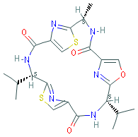 IUPAC name: (4S,11S,18S)-11-methyl-4,18-di(propan-2-yl)-6-oxa-13,20-dithia-3,10,17,22,23,24-hexazatetracyclo[17.2.1.15,8.112,15]tetracosa-1(21),5(24),7,12(23),14,19(22)-hexaene-2,9,16-trione