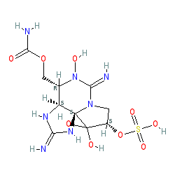 IUPAC name: (3aS,4R,9S,10aS)-4-((carbamoyloxy)methyl)-5,10,10-trihydroxy-2,6-diiminooctahydro-1H,8H-pyrrolo[1,2-c]purin-9-yl hydrogen sulfate