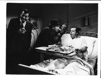 Harry Hinkle (Jack Lemmon) recovers in a hospital bed, midway through an exclamation. Luther “Boom Boom” Jackson (Ron Rich), who unintentionally put Hinkle in the hospital, grimaces. William H. "Whiplash Willie" Gingrich (Matthau, center), leans over Hinkle.