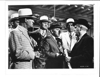 Chicago mob boss Spats Colombo (George Raft, center, with striped tie and dark fedora) and henchmen ((L-R) Harry Wilson (left front, holding golf clubs), Tipp McClure, Pat Comiskey, and Mike Marzuki), speak to Agent Mulligan (Pat O’Brien, right, in bowler hat) at the hotel’s mafia convention, aka the “Friends of Italian Opera Society 10th Annual Convention.”