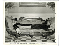 Joe-as-Josephine (Tony Curtis) and Jerry-as-Daphne (Jack Lemmon) lounge, arms hanging and feet up, on opposite sides of a dramatic chaise longue, both looking into the camera while holding cigarettes aloft.