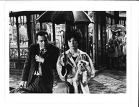 An unamused Irma (Shirley Maclaine) carries an umbrella in one hand and her dog, Coquette (Shorty), in the other. Nestor Patou (Jack Lemmon) trails behind her, lugging a suitcase.