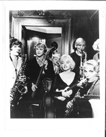 Sweet Sue and Her Society Syncopators perform: Joe-as-Josephine on tenor saxophone (Tony Curtis, left), Jerry-as-Daphne on upright bass (Jack Lemmon, second from left), Olga on clarinet (Marian Collier, lower right), Betty on alto saxophone (Joan Nicholas, upper right), and singer Sugar Kane on ukelele (Marilyn Monroe, center). Reflected in the mirror behind them is bandleader Sweet Sue (Joan Shawlee).
