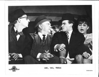(L-R): Schlemmer (Hanns Lothar), C.R. “Mac” MacNamara (James Cagney), Otto Ludwig Piffl (Horst Buchholz), and Scarlett Hazeltine (Pamela Tiffin) make their way to visit Hazel’s wealthy parents, Wendell (Howard St. John) and Melanie (Loïs Bolton). Below, label reading “ONE, TWO, THREE”