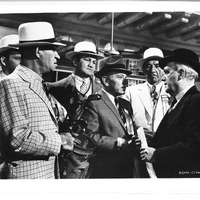Chicago mob boss Spats Colombo (George Raft, center, with striped tie and dark fedora) and henchmen ((L-R) Harry Wilson (left front, holding golf clubs), Tipp McClure, Pat Comiskey, and Mike Marzuki), speak to Agent Mulligan (Pat O’Brien, right, in bowler hat) at the hotel’s mafia convention, aka the “Friends of Italian Opera Society 10th Annual Convention.”