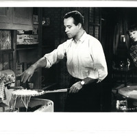 C.C. “Bud” Baxter (Jack Lemmon) uses a tennis racket to strain spaghetti while cooking for himself and Fran (Shirley MacLaine), who peeks into the kitchen to catch Bud’s shenanigans.