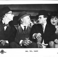 (L-R): Schlemmer (Hanns Lothar), C.R. “Mac” MacNamara (James Cagney), Otto Ludwig Piffl (Horst Buchholz), and Scarlett Hazeltine (Pamela Tiffin) make their way to visit Hazel’s wealthy parents, Wendell (Howard St. John) and Melanie (Loïs Bolton). Below, label reading “ONE, TWO, THREE”