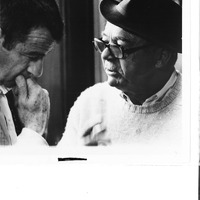 Walter Matthau (left), looks on thoughtfully as director Billy Wilder (right) speaks with him during the filming of The Front Page (1974).