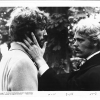 Front: Count Anton Chiluvsky (Christopher Gable, right) tenderly places his hand on Pyotr Tchaikovsky's (Richard Chamberlain, left) cheek, a large oval ring on his left middle finger. They look into each other's eyes before Tchaikovsky rebuffs him.