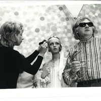 Front: (R-L) Ken Russell, dressed in a striped shirt and sunglasses, looks on along with Twiggy (center) as she has her hair touched up by hairstylist Barbara Ritchie.