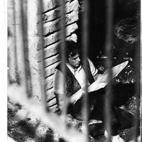 In a shot taken from above through the bars of a window, Henri Gaudier (Scott Anthony) sits on the muddy ground against a brick pillar. He appears to be reading intently.