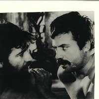 Gerald Crich (Oliver Reed, right) stares into Rupert Birkin (Alan Bates, left)'s eyes, a hand on his shoulder, both unclothed for the film's famous wrestling match. - Date Created