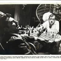 Captain Segura (Ernie Kovacs, left), dressed in his uniform, is passed out drunk in his wicker chair. Jim Wormold (Alec Guinness, right), disheveled in a white button-up and clearly also inebriated, sits on the other side of the table in another wicker chair. Wormold moves a shooter of whisky, one of many acting as pieces on a checkerboard, to make his final (winning? losing?) move now that Segura is unconscious. At the bottom, a typewritten caption: